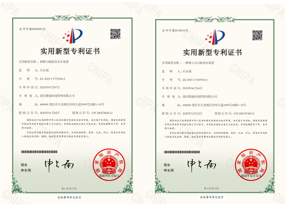 我司是全國白蟻防治標準化建設和實施的試點單位、是率先獲得“全國白蟻防治(高級)專業(yè)服務能力單位”、全國白蟻防治中心委員單位、堤壩白蟻防治標準流程化施工的創(chuàng)始單位、川渝地區(qū)首家開展白蟻防治技術培訓的教學單位、重慶市白蟻專委會理事單位、有害生物防治A級單位。